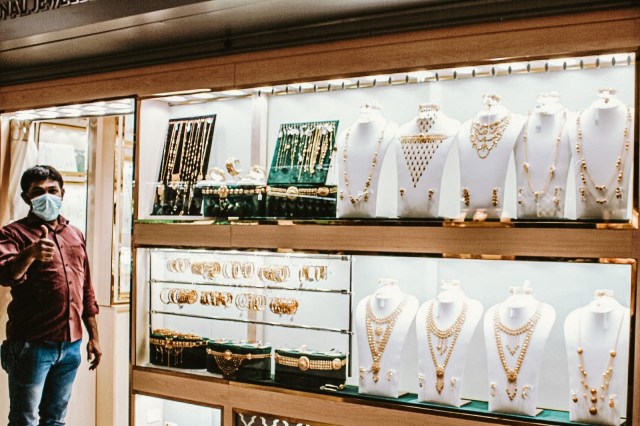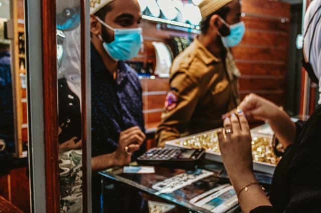 Ali Asghar been working in the gold market for 4 years , even though he was wearing a mask he had a happy face while having a discussion about the price details.